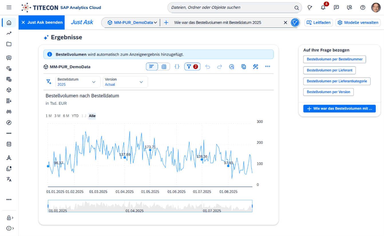 Mit Just Ask bietet SAC einen sprachbasierten Analysezugang, der Fachbereichen den eigenständigeren Umgang mit Daten erleichtert. Nutzer können analytische Fragestellungen in natürlicher Sprache formulieren und schneller auf relevante Informationen zugreifen. Dadurch sinkt die Abhängigkeit von spezialisierten BI-Rollen, und datenbasierte Entscheidungen können breiter im Unternehmen verankert werden.